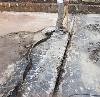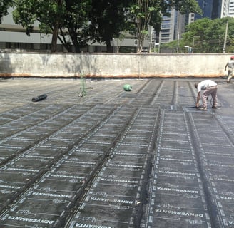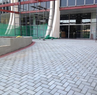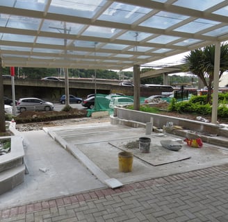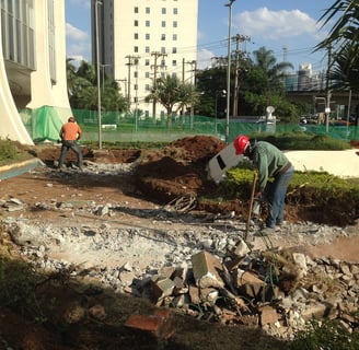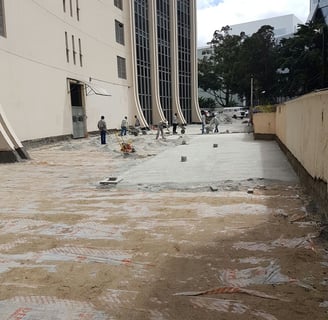Pátios externos, demolições, tratamento estrutural, impermeabilização, pavimentação, coberturas metálicas, marquise, pisos de porcelanato, hall de entrada, paisagismo, pintura.