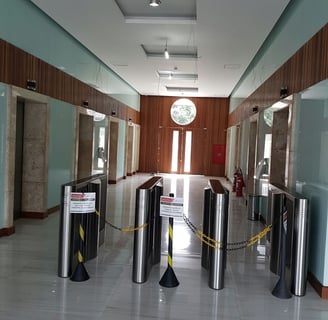Halls internos, piso de porcelanato, forro de gesso, iluminação, revestimentos de paredes ( vidros brancos e madeira ), pintura.